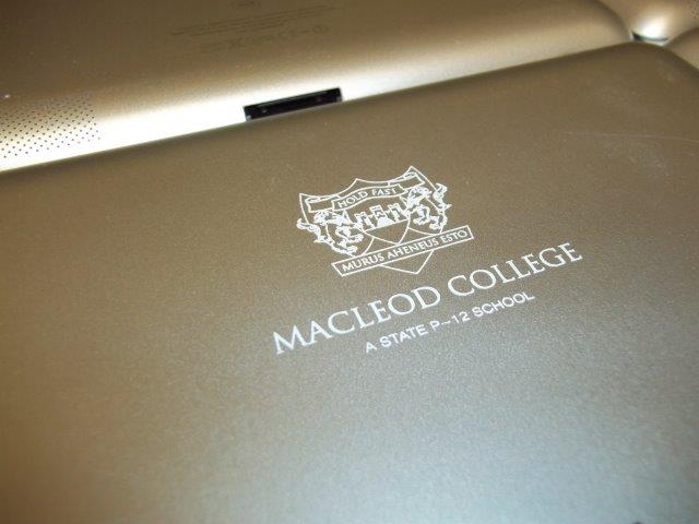 Laser marking leaves a permanent mark great for security! We can laser mark anodised aluminum objects leaving brilliant white or grey finish depending on the colour of the anodising. This mark is super durable and permanent mark. Below is a sample of one the services we provided for school security to there IT devices like IPad's or notebooks. It's a great anti theft deterrent and we can even put a barcode or your logo on it.
